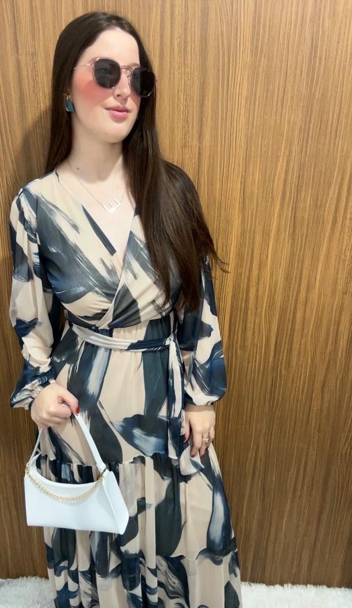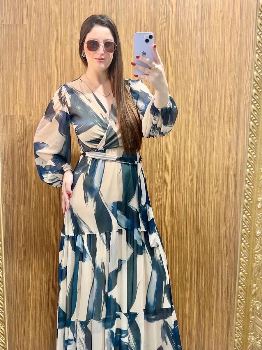 Confeccionado em tule leve e fluido, ele tem decote transpassado, mangas bufantes com elástico e cintura marcada que valoriza a silhueta. A estampa é sofisticada e atemporal, perfeita para eventos durante o dia ou à noite.